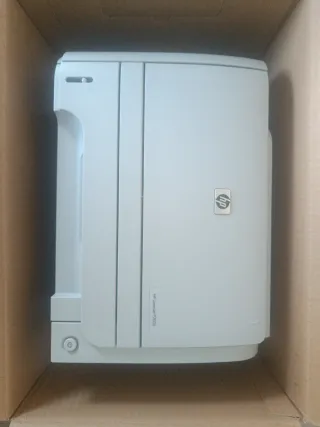 Impresora HP en buen estado, con un diseño moderno en tonos grises y blancos. - Ranuras para tarjetas de memoria. - Logo de HP grabado en la cubierta.