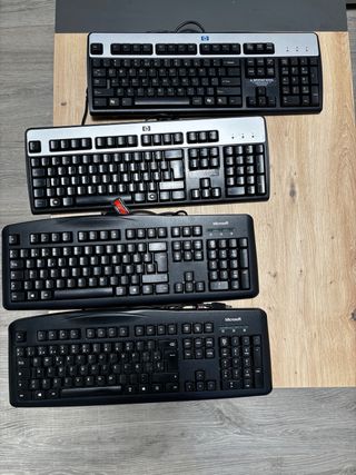 Conjunto de cuatro teclados de oficina, combinando diseños plateados y negros. - Dos teclados de la marca HP. - Dos teclados de la marca Microsoft. - Diseños ergonómicos para mayor comodidad. - 3 tipo ISO - 1 tipo ANSI LOTE COMPLETO 30 euros - individual tipo ISO : 9 euros - individual tipo ANSI : 7 euros
