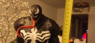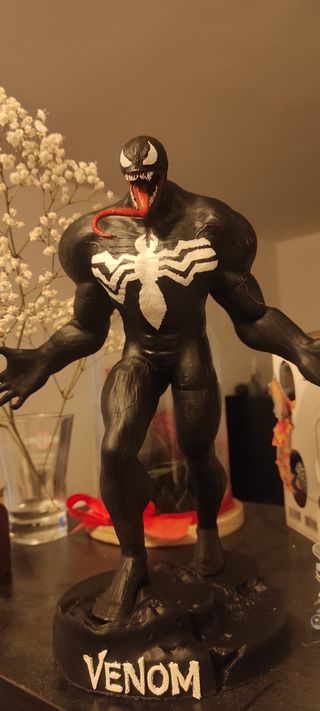 Venom hecho con PLA a impresora 3D pintado a mano y con barniz protector. Mide 30cm de alto y unos 25 de ancho.