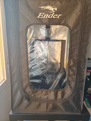 Cabina protectora para impresoras 3D, compatible con modelos tipo Ender. Diseñada para crear un entorno controlado para la impresión. - Material exterior de tela resistente. - Ventana transparente para visualización. - Cierre de cremallera frontal.