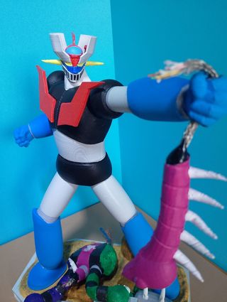 Figura de Mazinger Z con restos de batalla contra Gelbros J3,con restos de ella en la base. Hecha con impresora 3d y filamento tipo PLA duro y pintada a mano con pinturas Vallejo. Para amantes de Mazinger Z
