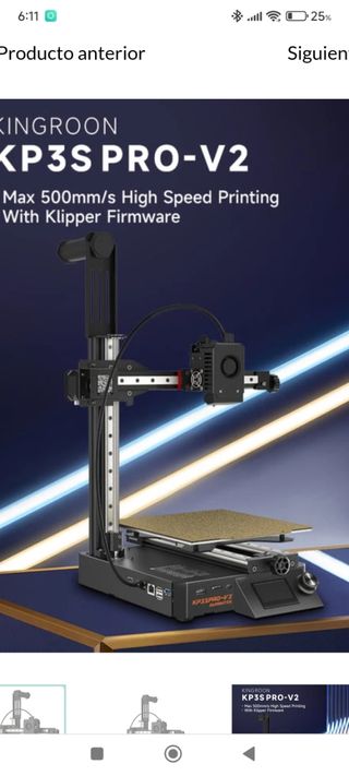 Impresora 3D Kingroon KP3S PRO V2 en excelentes condiciones. Es una impresora de alta velocidad, ideal para proyectos rápidos. EXTRAS- SECADORA DE FILAMENTOS, BOMBA DE VACIO con bolsas para evitar que el filamento coja humedad, FUNDA, 2 royos 1 PLA y 1 FLEXIBLE. Todo con sus correspondientes cajas. - Impresión a alta velocidad (hasta 500mm/s). - Aceleración de hasta 2000 mm/s². - Incluye firmware Klipper. - Imprime el barco benchi en menos de 25 minutos.