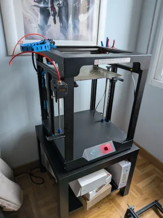 Impresora 3D robusta y en buen estado tras uso frecuente, ideal para proyectos avanzados y personalización. - Dimensiones: 595x595x1080 mm, volumen de impresión 345x215x300 mm - Estructura de aluminio 4080 y 2080, con ejes en ruedas V-Slot - Electrónica Bigtreetech SKR 1.4 TURBO de 32 bits, drivers TMC2209 para funcionamiento silencioso - Sensor inductivo en eje Z, extrusor TITAN AERO y sistema de ventilación de capa específico - Iluminación LED y MOSFET para cama caliente con lámina rugosa magnética Una impresora con gran potencial de personalización y lista para proyectos de gran tamaño.