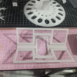 Soporte giratorio para pintar piezas de maquetas o miniaturas. Facilita el acceso a todas las partes. Echo con impresora 3D - Base circular con múltiples orificios. - Estructura superior para sujetar la pieza. - Permite girar la maqueta para pintar cómodamente.
