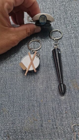 Conjunto de llaveros personalizados con motivos de Semana Santa. - Llavero con gorra de marinero. - Llavero con tambor y baquetas. - Llavero con forma de baqueta