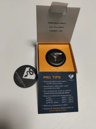 Boquilla para impresora 3D Diamondback, diseñada para impresión de precisión con cualquier filamento y mayor durabilidad. - Recomendación de torque: 2.5 Nm (Newton Meter). - Recalibrar z-offset después de la instalación para proteger la cama de impresión. - Se recomienda usar una torre de temperatura para encontrar las temperaturas óptimas, que suelen ser más bajas. - Temperaturas de inicio recomendadas: - PLA: 200°C - 215°C - PETG: 230°C - 250°C - PETG Carbon: 245°C - 265°C - Temperatura máxima: 300°C. Precio: 60€