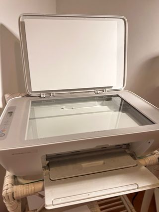 Impresora multifunción HP DeskJet 2630 en color blanco y azul. Usada unas 10 veces. Funciona perfectamente: imprime, escanea y copia. Ideal para casa o estudios. Incluye cable de alimentación.