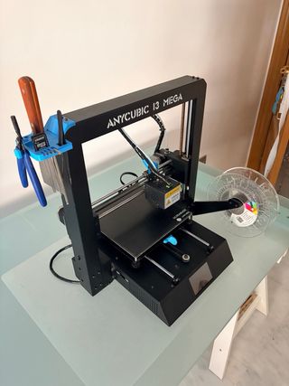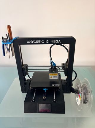 Impresora 3D Anycubic Mega en color negro y azul. Incluye soporte para herramientas y un rollo de filamento. - Soporte para herramientas integrado. - Algunas mejoras implementadas - Incluye rollo de filamento