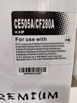 Tóner negro para impresoras HP LaserJet. PRECIO POR 1 CAJA/UNIDAD - Modelo: CE505A/CF280A - Color: Negro - Compatible con modelos: HP Laserjet P2030/P2033/P2034/P2035/P2035N/P2036/P2037/2050/P2053/P2054/P2055/P2055D/P2056/P2057/P2053DN/P2053X/P2054DN/P2054X/P2055DN/P2055X/P2056DN/P2056X/P2057DN/P2055X/P2056DN/P2057DN/P2057X. HP LASERJET PRO 400M401/ A/D/N/DN/DW/ M425 DN/DW CAN.LBP 6300/6650/MF5870DN