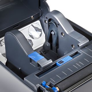 Impresora de etiquetas Zebra ZD220 en gris y amarillo. Ideal para negocios que necesitan imprimir etiquetas de forma eficiente. - Incluye rollo de etiquetas. - Mecanismo de carga de etiquetas sencillo.