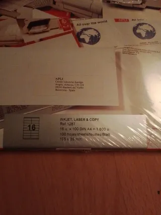 ✅ EN MUY BUEN ESTADO ✅ 🏷️ Marca: TopStick 🔖 Modelo: 8697 🎨 Color: blanco 📝 Descripción: Pack de 6500 etiquetas autoadhesivas universales para impresoras inkjet y láser. Ideal para oficina y hogar, permite etiquetado profesional y manual con alta calidad y respeto medioambiental. LPNWE290884084 - CEN/050 🔑 Palabras clave: etiquetas, autoadhesivas, impresora, oficina, etiquetado 🔗 Relacionadas: papel, adhesivo, impresión, etiquetado manual, oficina, etiquetas blancas, hojas A4, impresoras láser, impresoras inkjet, sostenible, respetuoso medio ambiente, etiquetas pequeñas 📦 etiquetas autoadhesivas para impresoras