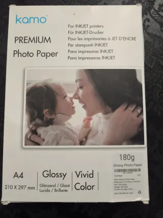 Papel fotográfico Kamo Premium de acabado brillante. - Tamaño A4 (210 x 297 mm). - Acabado Glossy / Brillante. - Ideal para impresoras de inyección de tinta (INKJET). - Peso: 180 GSM. - Contiene 96 hojas.