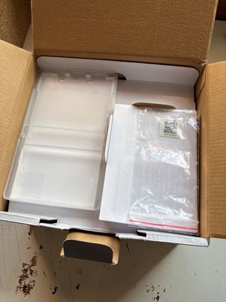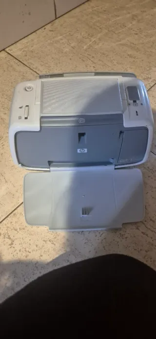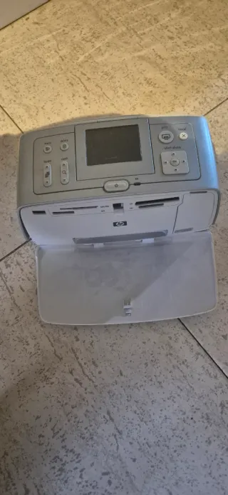 Impresora de fotos compacta marca HP. Incluye todo lo necesario para imprimir tus propias fotos: máquina, paquete de papel fotográfico para imprimir, CDs de instalación. Habría que poner tinta nueva.