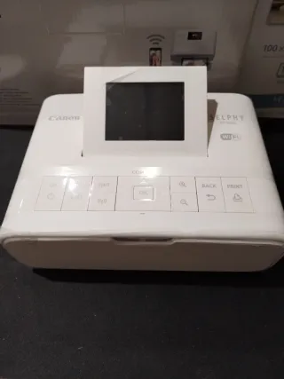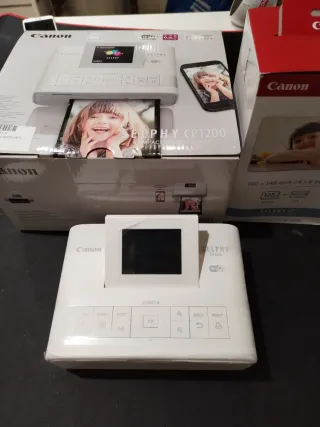 Impresora fotográfica compacta Canon Selphy CP1200 con conectividad WiFi. - Incluye adaptador de corriente. - Incluye manuales de usuario. - Incluye papel fotográfico Epson Glossy 4x6. - Incluye caja original y embalaje.