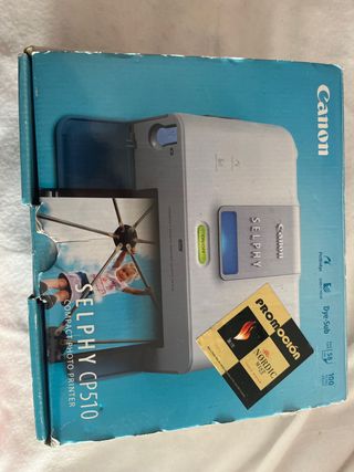 Impresora fotográfica compacta Canon SELPHY CP510. - Diseño portátil y fácil de usar. - Ideal para imprimir fotos directamente desde la cámara o smartphone. - Tecnología de impresión Dye-Sub.