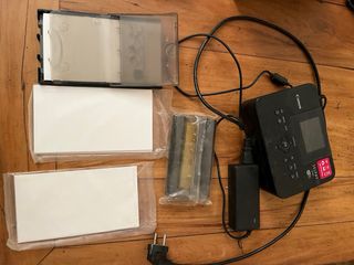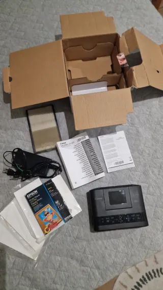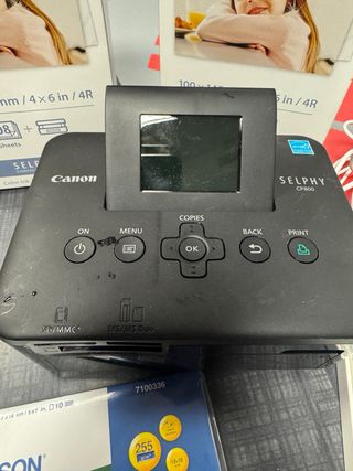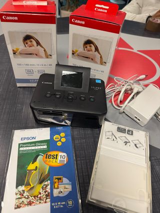 Impresora fotográfica Canon Selphy CP800 en color negro. Incluye accesorios para imprimir tus recuerdos. - Impresora Canon Selphy CP800. - Dos cajas de papel fotográfico Canon 100x148 mm (4x6 in/4R), 108 hojas cada una - una de ellas a mitad - Paquete de prueba Epson Premium Glossy Photo Paper 13x18 cm (5x7 in), 10 hojas. - Adaptador de corriente.