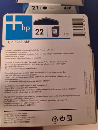 Lote de 4 cartuchos originales HP, nuevos y precintados: 2 uds. HP 21XL (Negro - 475 pág.) 2 uds. HP 22XL (Color - 415 pág.) Son versiones de alta capacidad (XL). Fechas de garantía 2012-2013. Al ser stock antiguo se venden a precio reducido y sin garantía técnica, aunque están sellados al vacío. Ideal para ahorro en impresión. Precio: 40 €
