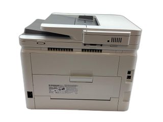 Impresora multifunción HP en color blanco y gris. Tiene un pequeño fallo al imprimir el color negro. - Bandeja de papel extraíble. - Panel de control con pantalla LCD.
