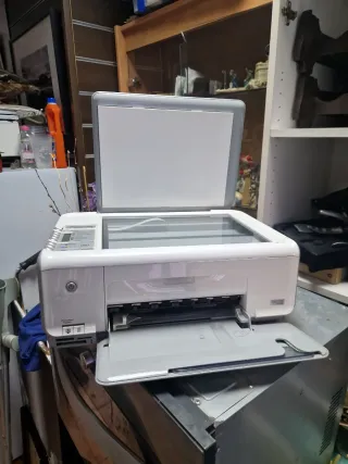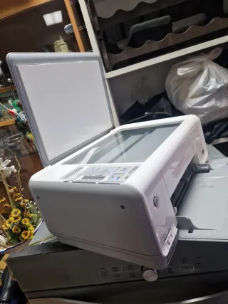 Impresora multifunción HP en color blanco y gris. Cuenta con una pantalla táctil para facilitar su uso. - Pantalla táctil a color. - Bandeja de entrada de papel. - Escáner integrado. La impresión en color a veces da ERROR.31 y hay que apargarla Venta en persona en Burgos
