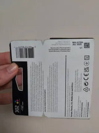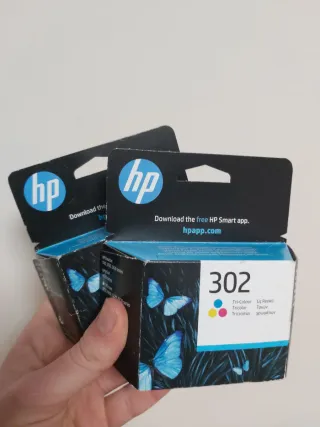 Pack de dos cartuchos de tinta HP 302 Tricolor. Los dos x 10 euros - Cartuchos de tinta HP 302. - Color: Tricolor (CMY). - Modelo: 302. Caducados este julio 2025, pero se pueden usar perfectamente ya que la caducidadde estas cosas la ponen pronto para cubrirse las espaldas, pero yo con mi antigua impresora use cartuchos así sin problema.