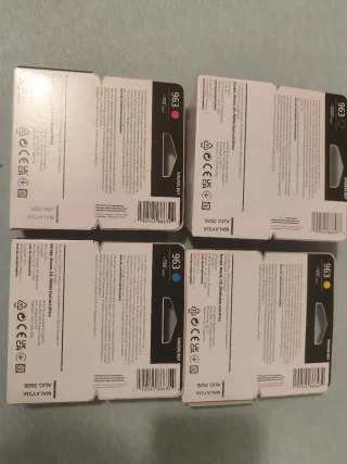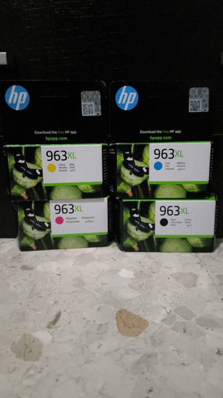 Pack de cuatro cartuchos de tinta HP 963 orignales. - Cartucho 963 Magenta. - Cartucho 963 Negro. - Cartucho 963 Cyan (parece un poco abierto pero está cerrado). - Cartucho 963 Amarillo. Se venden los cuatro colores por 50 o cada uno por 15 Caducidad agosto 2026 Se vende por cambio de impresora