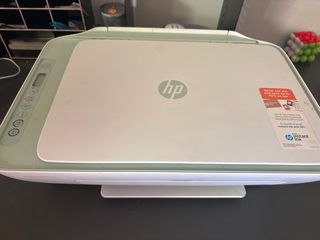 Impresora HP multifunción en color blanco y coral. Está en muy buen estado. - Imprime, escanea y copia. - Incluye cable de alimentación y cable USB.