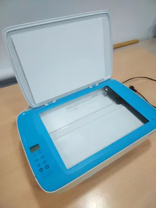 Impresora multifunción HP Deskjet 3639 en color azul y blanco. Ideal para el hogar o la oficina. Le cambié la tinta y desde entonces no he sabido qué hacer con unas rallitas que hace al imprimir. Se ha usado poco. Hasta que se acabó la tinta. Los cartuchos son nuevos. Cómo no tengo ni idea de estas cosas seguro que es una tontería. Venta en persona. . - Escáner integrado. - Pantalla digital. - Botones de control.