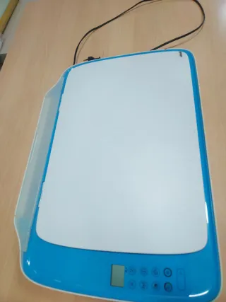 Impresora multifunción HP en color blanco y azul, tiene un fallo que las hojas no salen bien copiadas es decir salen a medias, no se cuanto debe ser el precio del arreglo pero no creo que más de 40€, está muy bien la use muy poco y ya fallo y paso de arreglarla para el poco uso que le doy.