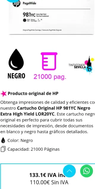 Cartucho de tinta original HP 981YC Negro Extra High Yield. - Color: Negro - Capacidad: 21000 Páginas