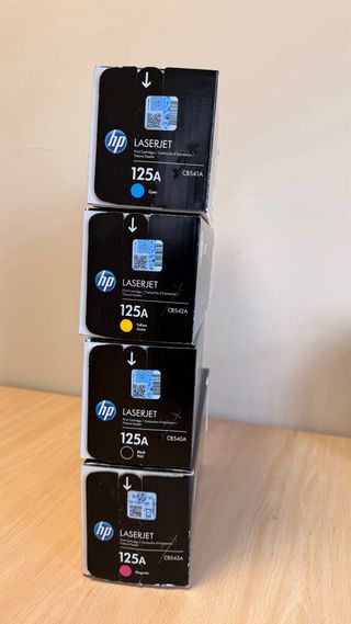 Pack de cuatro cartuchos de tóner HP 125A. - 1 cartucho de tóner Cyan (CB541A) - 1 cartucho de tóner Amarillo (CB542A) - 1 cartucho de tóner Magenta (CB543A) - 1 cartucho de tóner Negro (CB540A)