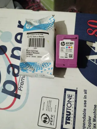 Dos cartuchos de tinta HP Instant Ink 67/305. - Un cartucho es negro. - El otro cartucho es tricolor.