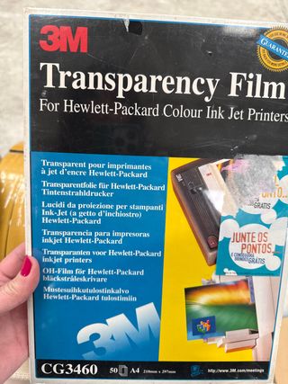 Paquete de transparencias 3M para impresoras de inyección de tinta Hewlett-Packard. - Modelo CG3460. - Formato A4 (210mm x 297mm). - Contiene 50 hojas.