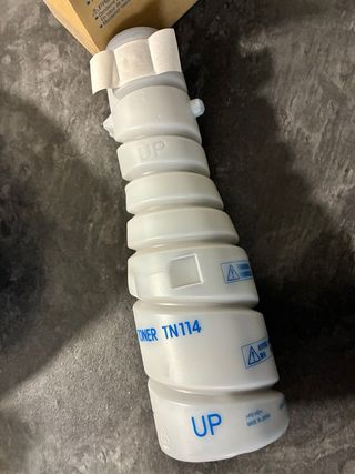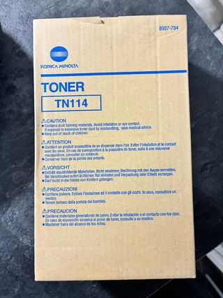 Cartucho de tóner TN114 de Konica Minolta. Contiene materiales que forman polvo. - Evitar la inhalación y el contacto con los ojos. - En caso de exposición excesiva, consultar a un médico. - Mantener fuera del alcance de los niños.