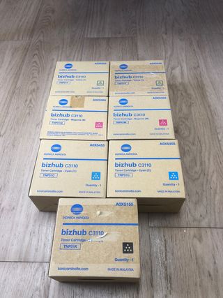 Cajas de tóner para Konica Minolta bizhub C3110. - Tóner Amarillo (Yellow) TNP51Y - Tóner Magenta (Magenta) TNP51M - Tóner Cian (Cyan) TNP51C - Tóner Negro (Black) TNP51K - Cantidad: 1 unidad por caja. - Fabricado en Malasia. Nuevos sin abrir. precintados. 80€ el pack de los 7.