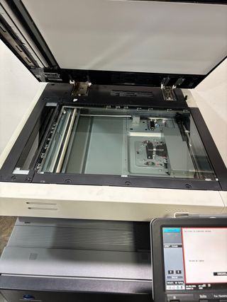 Copiadora Konica Minolta en color y blaco y negro. Diseñada para ser una solución versátil para tus necesidades de oficina, tamaño A4 y A3 - Panel de control táctil. - Bandejas de papel. - Tapa superior abierta para escanear.