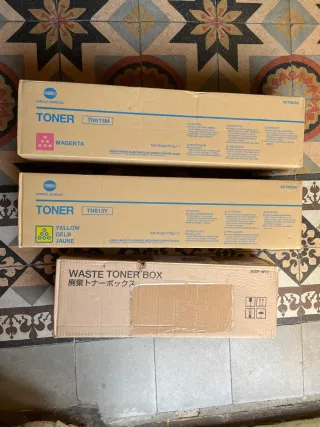 Lote de tóneres Konica Minolta. - Tóner Magenta modelo TN613M. - Tóner Amarillo modelo TN613Y. - Incluye caja de tóner residual (Waste Toner Box).