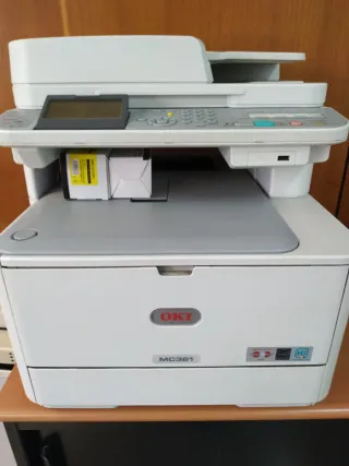 Impresora láser multifunción OKI MC361 en color blanco y gris. - Bandeja de entrada de papel. - Fotocopiadora - Panel de control con pantalla. - Puerto USB y Ethernet - 2 toners nuevos, faltará otros 2. - fax