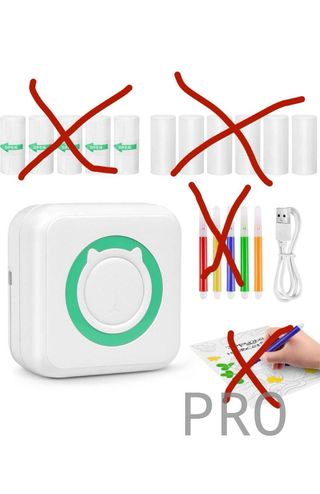 Mini impresora portátil para impresión instantánea. Incluye varios rollos de papel y rotuladores de colores. - Impresora portátil con conexión Bluetooth. - Varios rollos de papel de impresión. - Set de rotuladores de colores.