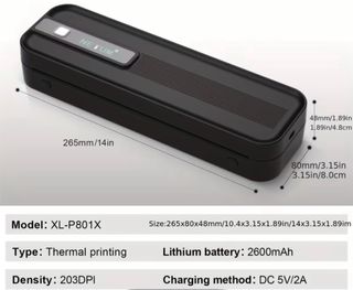 Impresora térmica portátil NETUM XL-P801X en color negro. Ideal para llevar contigo. - Modelo: XL-P801X - Tipo: Impresión térmica - Densidad: 203DPI - Batería de litio: 2600mAh - Método de carga: DC 5V/2A - Dimensiones: 265x80x48mm NETUM Impresora Térmica Portátil A4 - Conexión Inalámbrica y USB, Impresión de Múltiples Tamaños, Compatible con Papel en Rollo/Dobladura, Salida Monocromática sin Tinta, Soporta PDF/Word/Excel/JPG, 203dpi Alta Definición, Batería Recargable Integrada de 2600mAh, Ideal para Teléfonos/Tabletas/Laptops/Computadoras (Valida para iPhones, androids, iPad) Sin abrir, en su embalaje.
