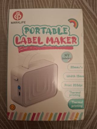 Impresora de etiquetas portátil Marklife M1, ideal para crear etiquetas personalizadas. - Incluye cable Tipo-C. - Incluye rollo de papel blanco. - Manual de usuario. - Diseño compacto y ligero.