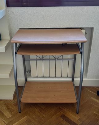 Mesa para ordenador de pequeño tamaño. En perfecto estado. Compacta ¡Ideal si tienes poco espacio! De color cerezo, con bandeja extraible para teclado. Tiene balda inferior para poner impresora o documentos. En perfecto estado. Se recoge en Madrid. No envío. Entrego montada, tal cual se ve en las fotos. Alto: 78cm Ancho 65cm Fondo: 50cm las patas (tablero superior 38cm. con bandeja de teclado abierta 56cm) escritorio mesa trabajo portatil monitor estudiar trabajar madera y metal pequeña