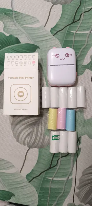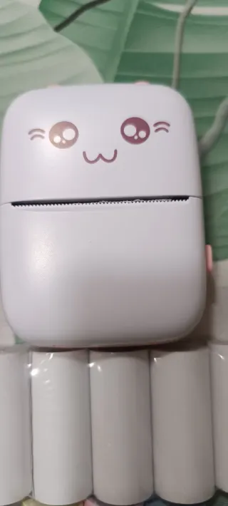 Pequeña impresora térmica con un adorable diseño. - Incluye varios rollos de papel térmico. - Diseño frontal con cara sonriente y ojos grandes.