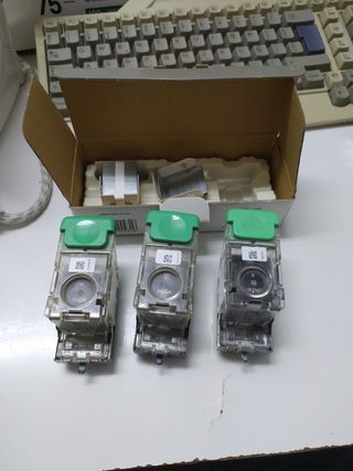 Grapas J1 + Mecanismos de grapadoras tipo K para Ricoh 7500, 8000, 7001, 8001, 9001, 9002 1 recarga llena + 1 usada. 3 mecanismos: 1 usado, 1 a medias, 1 casi lleno