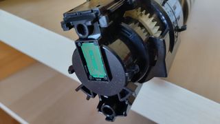 Una unidad magenta sin desprecintar (plástico donde se aloja el toner cerrada)