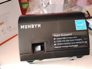 Impresora térmica MUNBYN en blanco y negro. Ideal para etiquetas. - Puerto USB para conexión. - Interruptor de encendido/apagado. - Cable de alimentacion y conector USB.