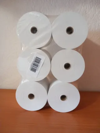 Pack de rollos de papel térmico para imprimir tiques. Hay 6 packs. Descuento si quiere más de uno