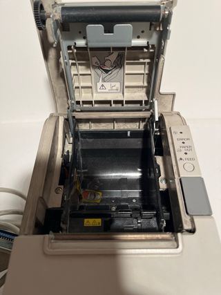 Impresora de tickets compacta y fiable. - Diseño en color gris claro. - Ranura para salida de papel. - Indicadores LED para estado (Power, Error, Paper Out). - Botón de avance de papel (Feed). Funciona perfectamente y se dan los cables de conexión.