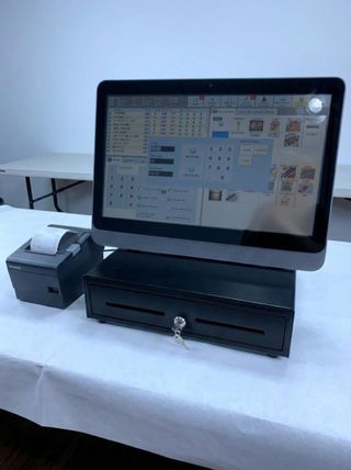 Sistema TPV completo para tu negocio. - Monitor plateado. - Cajón portamonedas negro sin llave. - Impresora de tickets OKI.
