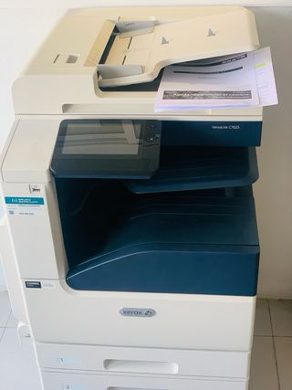 Impresora multifunción Xerox VersaLink C7025 en blanco y azul. Ideal para oficinas. - Funciones de impresión, escaneo y copia. - Pantalla táctil para fácil manejo. - Bandejas de papel de gran capacidad.