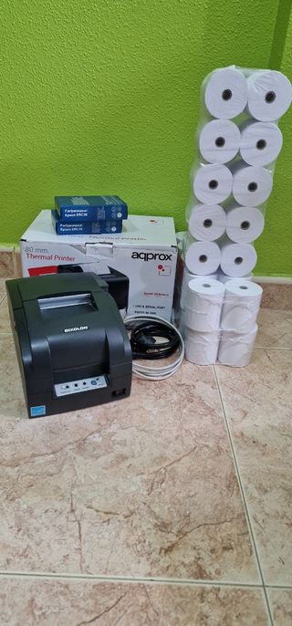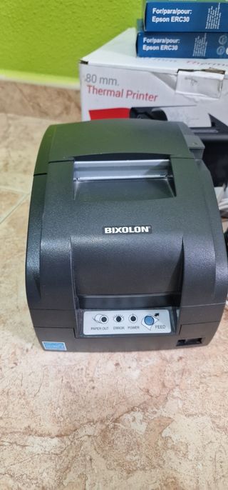 Se vende impresora térmica Bixolon en color negro, ideal para negocios. Incluye varios rollos de papel. - Impresora térmica de 80 mm. - Velocidad de impresión de 200 mm/s. - Conexiones USB y Serial. - Incluye dos cajas de cintas para Epson ERC30. Incluye 3 paquetes de rollos de papel para ticket sin abrir, en total 30 rollos Se ha usado 2 años, pero está perfectamente, hemos cambiado el ordenador y no nos sirve, nueva cuesta 90€, sin contar los rollos y la tinta.